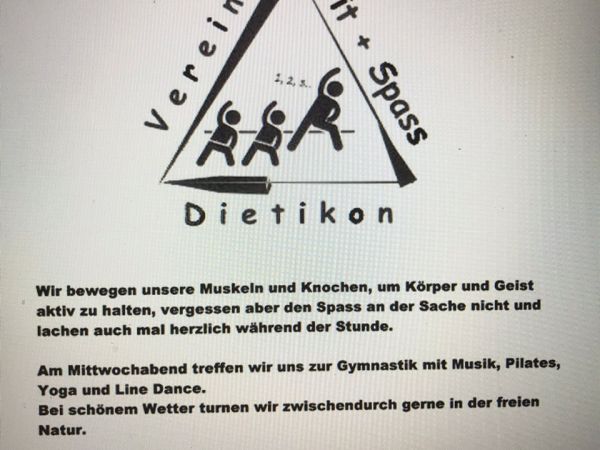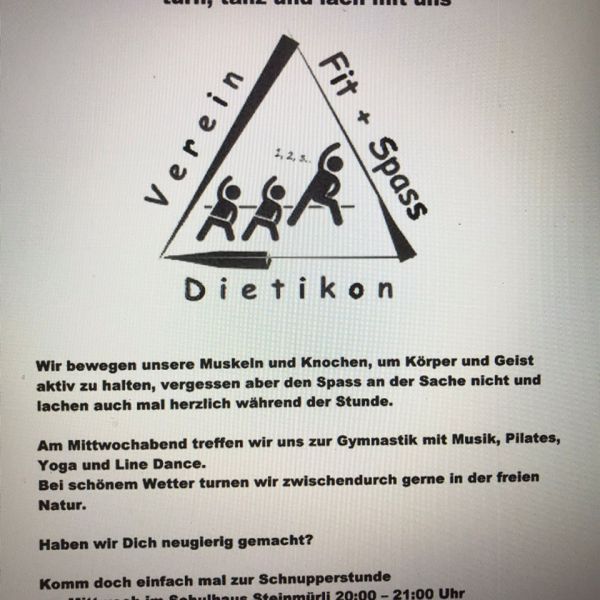 Wir sind ein unabhängiger Verein ohne Verpflichtungen. Am Mittwochabend treffen wir uns zur Gymnastik, Pilates, Line Dance oder Yoga. Wobei der Spass nie zu kurz kommt.