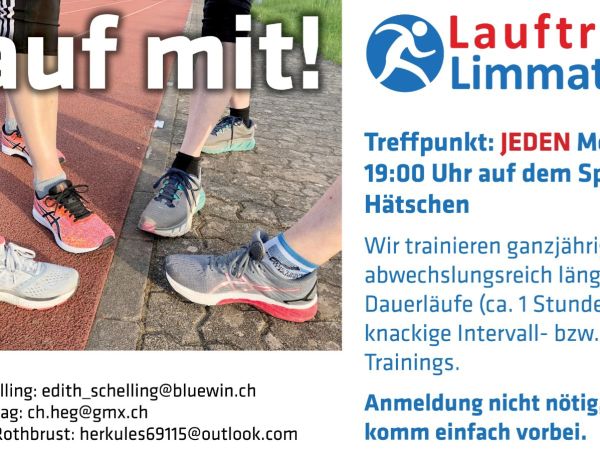 Wir sind ein offener Lauftreff, der sich jeweils montags um 19:00 auf dem Hätschen in Dietikon für einen einstündigen Lauf oder Lauftraining trifft. Eine Mitgliedschaft gibt es nicht.